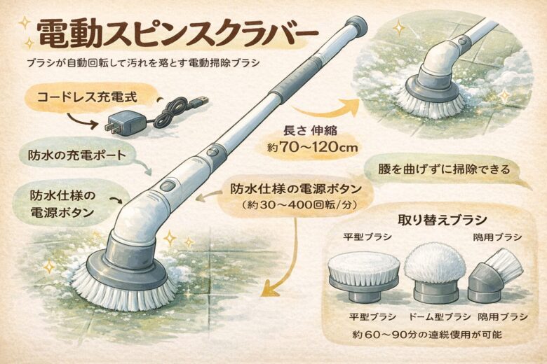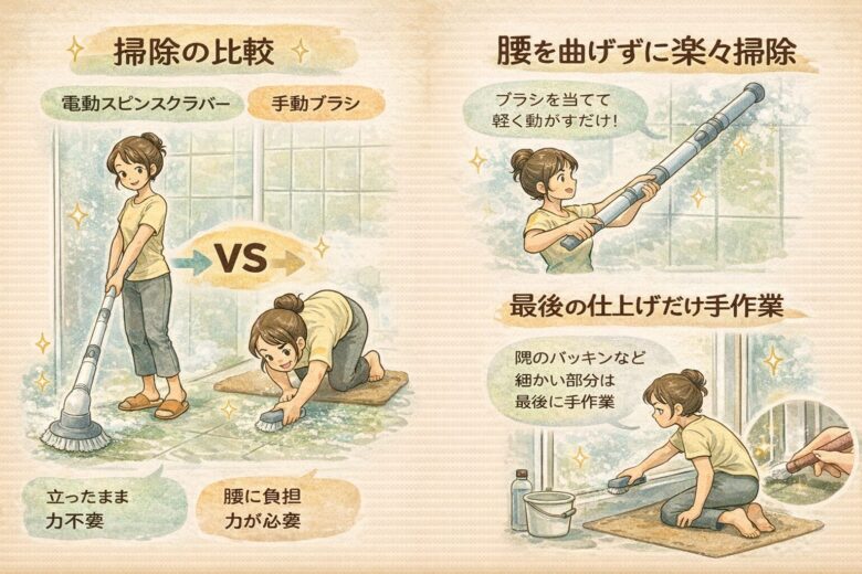 電動スピンスクラバーは、汚れを落とす役目を“人の腕”から“機械”に移してくれます。